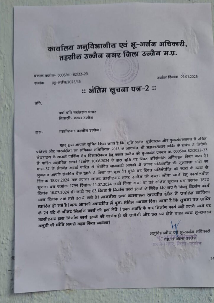 अक्षरविश्व न्यूज उज्जैन। महाकाल लोक के दायरे में आ रहे 257 मकानों पर प्रशासन ने योजना बना कर जेसीबी चलाई। कोई विरोध नहीं हुआ। मुआवजा लेकर मकानों में रहने वालों ने स्वैच्छा से सामान हटा कर मकान खाली कर दिए। अपने वाहनों से सामान ले जाया गया। किसी भी अप्रिय घटना से निपटने के लिए पुलिस प्रशासन दलबल के साथ तैयार था, लेकिन ऐसी नौबत नहीं आई। एक दिन पहले ही इलाके में फ्लैग मार्च निकाल कर पुलिस प्रशासन ने अपने इरादे जाहिर कर दिए थे। प्रशासन द्वारा की गई इस कार्रवाई की पूरे शहर में चर्चा रही। सूत्र तो यहां तक बताते हैं कि रिपोर्ट क्रमानुसार भोपाल भी भेजी गई। वरिष्ठ अधिकारी अपने मातहतों से पल-पल की जानकारी लेते रहे।