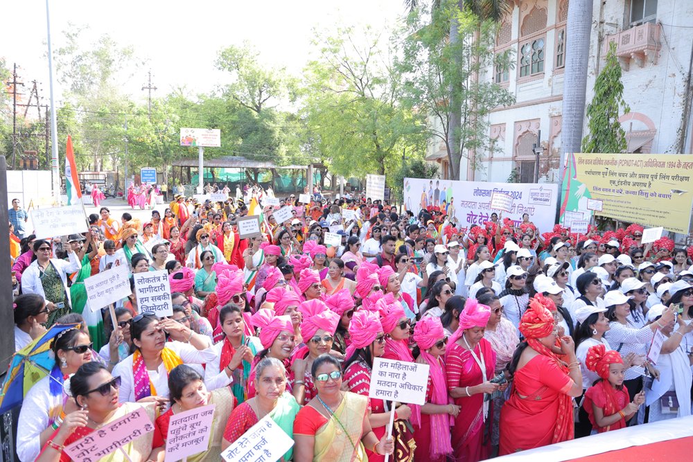 वुमन पॉवर रैली में अलग-अलग वेशभूषा धारण करने के साथ साफे पहन मतदाताओं को जागरूक करने वाले स्लोगन की तख्तियां हाथों में लिए नारी शक्ति शपथ दिलाते कलेक्टर नीरज कुमार सिंह, अक्षरविश्व की मैनेजिंग डायरेक्टर डॉ. श्रुति जैन और प्रबंध संपादक श्रेय जैन