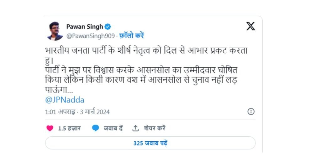 अब पवन सिंह ने सोशल मीडिया पर पोस्ट साझा कर आसनसोल से चुनाव न लड़ने के फैसले की जानकारी दी। उन्होंने लिखा कि ‘भाजपा के शीर्ष नेतृत्व को दिल से आभार प्रकट करता हूं। पार्टी ने मुझ पर विश्वास करके आसनसोल से उम्मीदवार घोषित किया, लेकिन किसी कारणवश में आसनसोल से चुनाव नहीं लड़ पाऊंगा।’