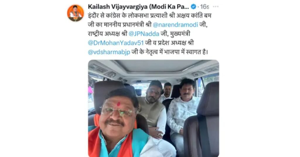 मंत्री विजयवर्गीय ने सोशल मीडिया प्लेटफार्म X पर लिखा कि इंदौर से कांग्रेस के लोकसभा प्रत्याशी अक्षय कांति बम का भाजपा में स्वागत है।