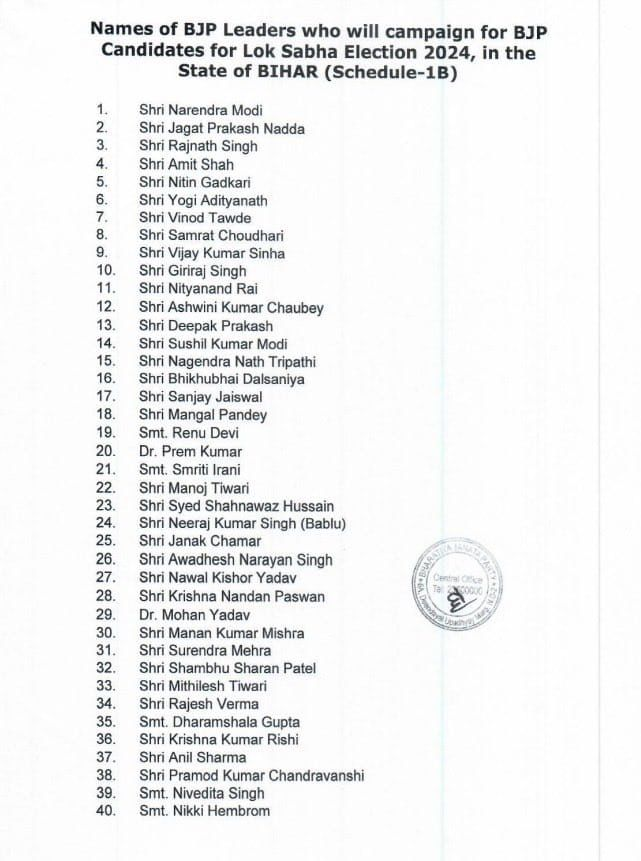 Lok Sabha Election 2024:BJP के स्टार प्रचारकों की लिस्ट जारी