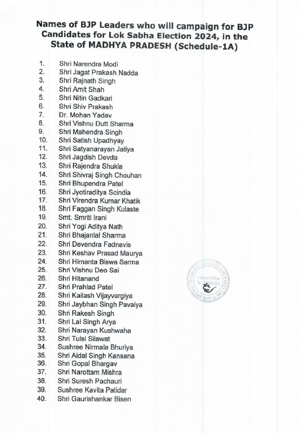 मध्य प्रदेश लोकसभा चुनाव में प्रचार के लिए भाजपा ने 40 स्टार प्रचारकों की लिस्ट जारी की है। इसमें प्रधानमंत्री नरेन्द्र मोदी, जेपी नड्डा, राजनाथ सिंह, अमित शाह, नितिन गडकरी, शिव प्रकार, सीएम मोहन यादव, वीडी शर्मा और ज्योतिरादित्य सिंधिया का नाम भी शामिल हैं। मध्य प्रदेश के अलग-अलग क्षेत्रों में ये स्टार प्रचारक भाजपा प्रत्याशियों के पक्ष में सभाएं करेंगे।