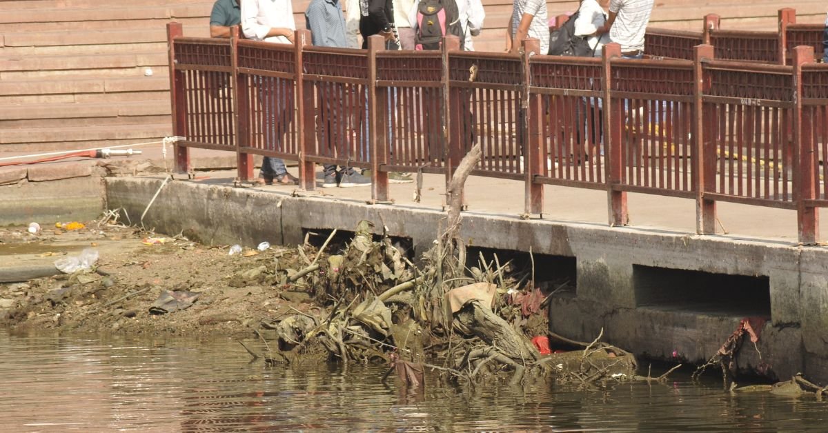 नदी में गाद के साथ दिख रहे हैं मूर्तियों के स्ट्रक्चर, वृक्षों की शाखाएं, बैरिकेड्स और भी बहुत कुछ अक्षरविश्व…