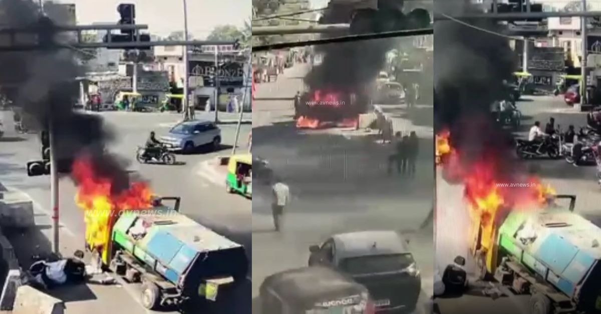 सिग्नल पर खड़े कचरा वाहन में लगी आग,मची अफरा-तफरी