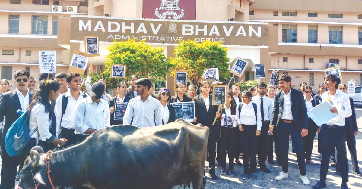 अक्षरविश्व न्यूज उज्जैन। सोमवार दोपहर उस समय लोग भौंचक्के रह गए जब भावी वकील सड़क पर भैंस चराते नजर आए। काला कोट पहने और हाथों में तख्तियां थामे वकालात के इन स्टूडेंट्स का कहना था कि हमें पढ़ाने के लिए टीचर ही नहीं है इसलिए हमारे लिए हर काला अक्षर भैंस बराबर है। रैली जहां से भी गुजरी लोग अचरज से उन्हें देखते रहे।