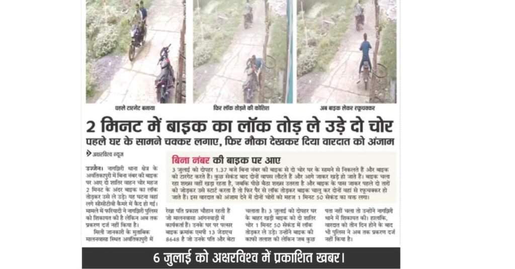 जानकारी के मुताबिक मालनवासा स्थित अवंतिकापुरी कॉलोनी में रेखा पति प्रकाश चौहान रहती हैं जो मालनवासा आंगनवाड़ी में कार्यकर्ता हैं। उनके घर पर पल्सर बाइक क्रमांक एमपी 13 जेडएच 8648 है जो उनके पति प्रकाश पिता अंबाराम चौहान और बेटा चलाता है। ३ जुलाई को दोपहर घर के बाहर खड़ी बाइक को दो शातिर चोर 1 मिनट 50 सेकंड में लॉक तोडक़र ले उड़े। उन्होंने बाइक की काफी तलाश की लेकिन जब कुछ पता नहीं चला तो नागझिरी थाने में शिकायत की। वारदात के तीन दिन बाद सोमवार को पुलिस ने मामले में प्रकरण दर्ज किया है। अब वाहन चोरों की तलाश की जा रही है।