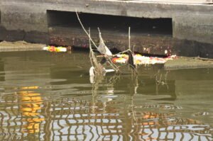 नदी में गाद के साथ दिख रहे हैं मूर्तियों के स्ट्रक्चर, वृक्षों की शाखाएं, बैरिकेड्स और भी बहुत कुछ