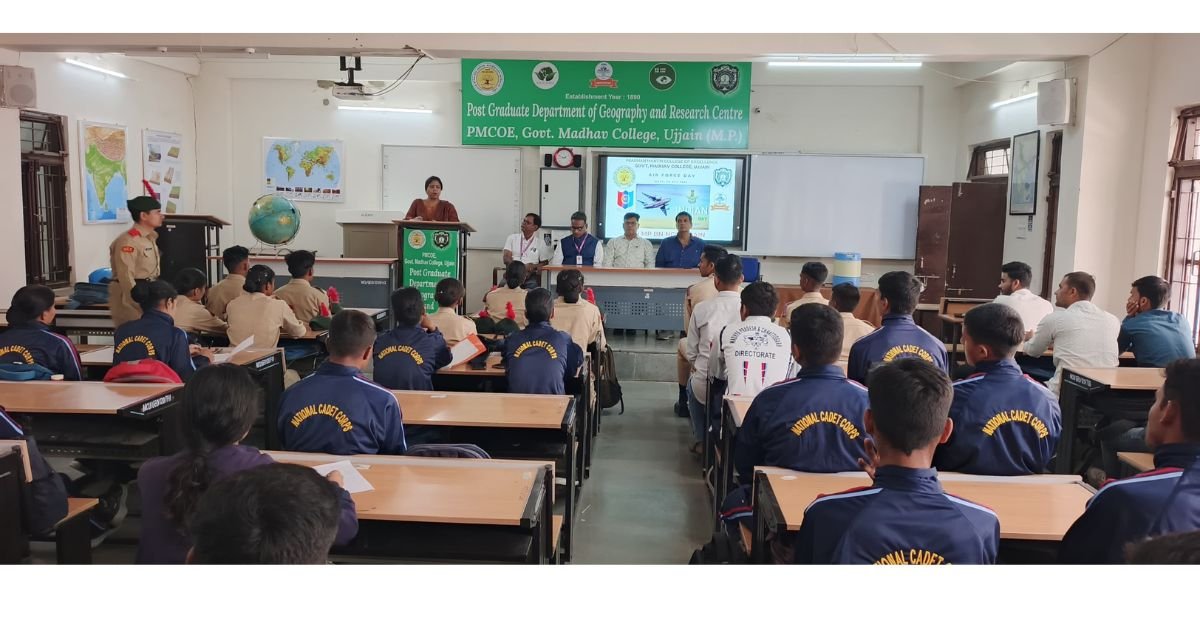 उज्जैन। माधव कॉलेज (प्रधानमंत्री कॉलेज ऑफ एक्सीलेंस) में एनसीसी कैडेट्स ने भारतीय वायुसेना दिवस मनाया। 8 अक्टूबर 1932 को स्थापित हुई वायुसेना को प्राचार्य प्रो. कल्पना वीरेंद्र सिंह ने देशभक्ति और गौरव का प्रतीक बताया।