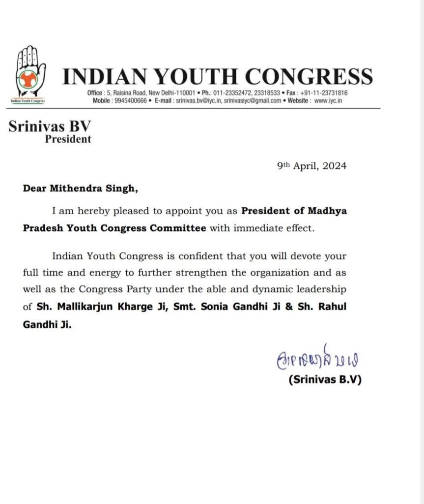 कांग्रेस ने घोषित किया यूथ कांग्रेस का नया प्रदेश अध्यक्ष