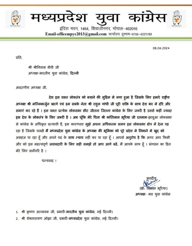 अपने पत्र में विक्रांत भूरिया ने कहा कि ‘देश इस वक्त लोकतंत्र को बचाने की मुहिम में लगा हुआ है जिसके लिए हमारे राष्ट्रीय अध्यक्ष मल्लिकार्जुन खरगे एवं हम सबके नेता राहुल गांधी जी पूरी शक्ति के साथ देश भर में दौरे और सभाएं कर रहे हैं। इस वक्त प्रत्येक लोकसभा सीट जीतना जितना कांग्रेस के लिए जरूरी है उससे कहीं ज्यादा इस देश के लोकतंत्र के लिए जरूरी है। अब चूंकि मेरे पिता कांतिलाल भूरिया रतलाम-झाबुआ लोकसभा से कांग्रेस के अधिकृत प्रत्याशी हैं, इस कारणवश मुझे अपना अधिकतम समय इस लोकसभा क्षेत्र में देना पड़ रहा है जिसके चलते मैं मध्यप्रदेश युवा कांग्रेस के अध्यक्ष की भूमिका को पूरे प्रदेश में निभाने में खुद को असहज पा रहा हूं और अपने पद के साथ न्याय नहीं कर पा रहा हूं। आपसे अनुरोध है कि अगर आप किसी और को इस महत्वपूर्ण जवाबदारी के लिए सही समझें तो आप आगे बढ़ें, मैं आपके साथ हूँ। संगठन का हित मेरे लिए सर्वोपरि है।’