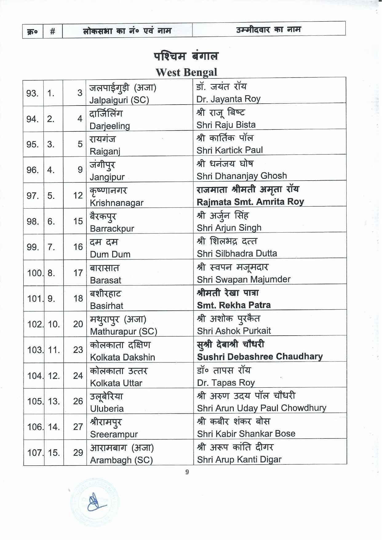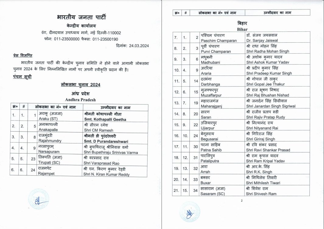 भारतीय जनता पार्टी (भाजपा) ने लोकसभा चुनाव के लिए रविवार को 111 उम्मीदवारों की पांचवीं सूची जारी कर दी। पार्टी अब तक 402 लोकसभा सीटों के लिए उम्मीदवारों का एलान कर चुकी है।