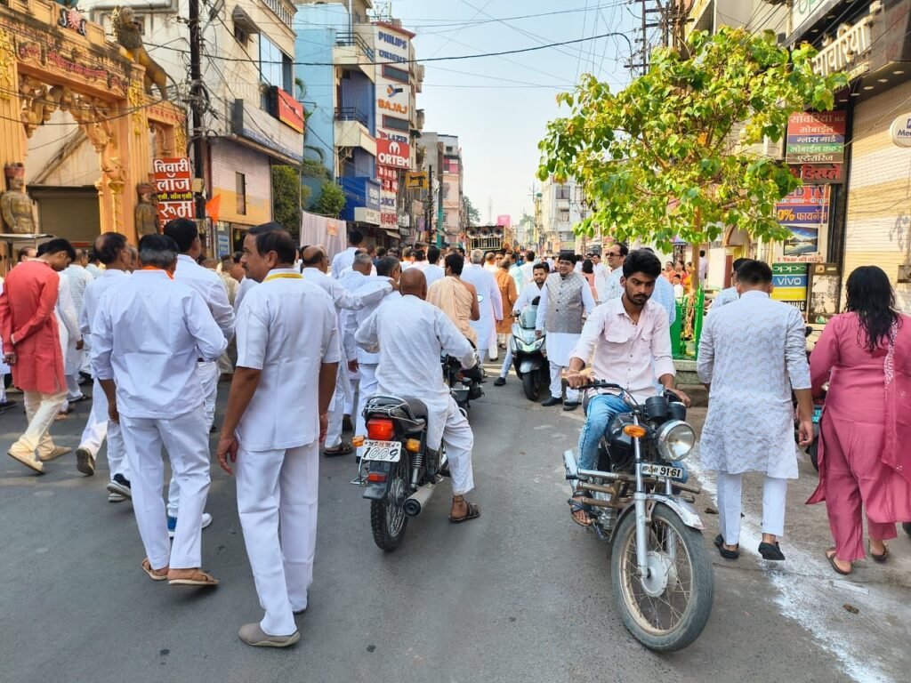 उज्जैन। त्रिशलानंदन वीर की, जय बोलो महावीर की… गुरुवार को यह नारे गूंजते रहे। मौका था भगवान महावीर स्वामी की जयंती का। सुबह 7.30 बजे नमकमंडी स्थित श्री चंदाप्रभु दिगंबर जैन मंदिर से शोभायात्रा की शुरुआत हुई। चांदी की वेदी में भगवान महावीर निकले। रथ को महिलाओं ने खींचा। इसमें पुरुष सफेद वस्त्र तो महिलाएं केसरिया और लाल साड़ी पहनकर शामिल हुईं। शोभायात्रा के आगे बच्चे ड्रम बजाते हुए चल रहे थे तो बैंड पर भक्ति गीत गूंज रहे थे जिस पर जैन समाजजन भगवान महावीर की भक्ति में सराबोर होकर जमकर थिरके। शोभायात्रा नमकमंडी, छोटा सराफा, कंठाल, नईसडक़, दौलतगंज, तोपखाना, पटनी बाजार, छत्रीचौक से बड़ा सराफा होते हुए पुन: नमकमंडी पहुंची। इस दौरान जगह-जगह मंच बनाकर शोभायात्रा का स्वागत किया गया।