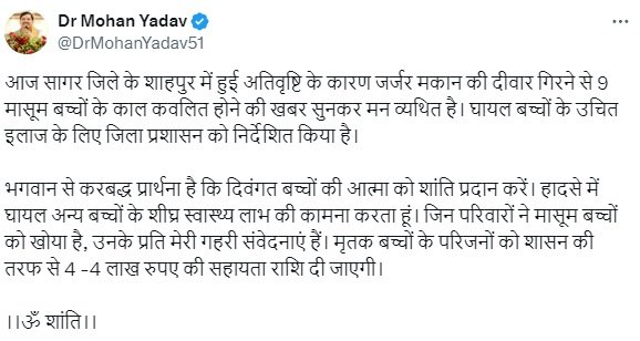 घटना को लेकर मुख्यमंत्री डॉ. मोहन यादव ने शोक व्यक्त करते हुए मृतक बच्चों के स्वजन को 04-04 लाख रुपये आर्थिक सहायता देने की घोषणा की। उन्होंने जिला प्रशासन के अधिकारियों से फोन पर बात कर घटना का ब्यौरा लिया और घायल बच्चों को उचित इलाज मुहैया कराने के निर्देश दिए।