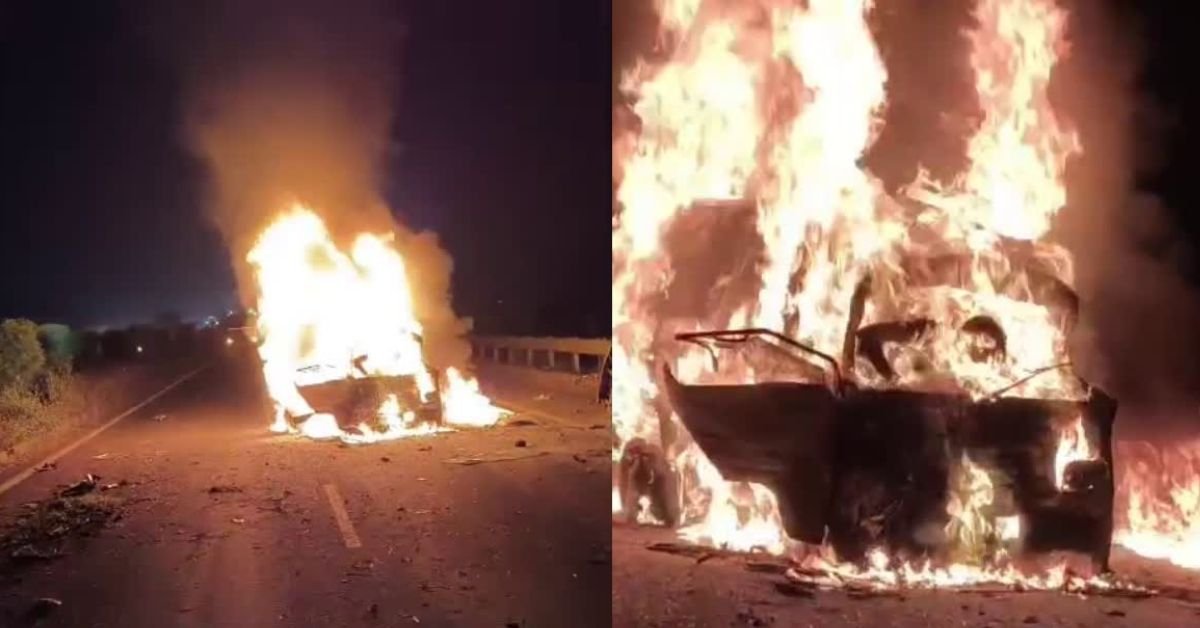 जो दूसरी ओर सामने से आ रही ओमनी कार से टकराकर पलट गई। टक्कर के बाद ओमनी कार में भीषण आग लग गई, जिसमें सवार दो लोग जिंदा जल गए। स्विफ्ट कार सवार महाकाल दर्शन के लिए उज्जैन जा रहे थे।