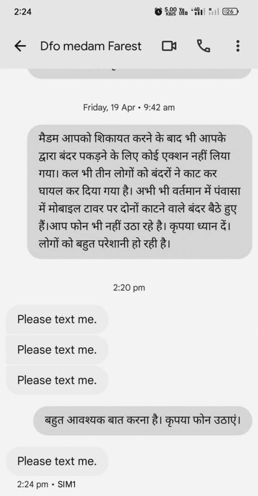 ग्रामीणों ने डीएफओ को टैक्स्ट मैसेज किया कि बंदर मोबाइल टॉवर पर बैठे हैं और लोगों को काटकर घायल कर रहे हैं। उक्त टैक्स्ट मैसेज लिखने पर भी डीएफओ किरण बिसेन के मोबाइल से फिर मैसेज आया प्लीज टैक्स्ट मी। ग्रामीणों के अनुसार बंदरों के आतंक से लोगों का घर से निकलना दूभर हो चुका है। जरूरी काम के लिये घर से निकलने वाले लोग हाथों में डंडे और पत्थर लेकर चल रहे हैं। वन विभाग के पास 10 लोगों की रेस्क्यू टीम है लेकिन उनका काम देखकर वह भी अनट्रेंड ही नजर आते हैं क्योंकि आतंकी बंदर को पकड़ने में इतना समय नहीं लगता।