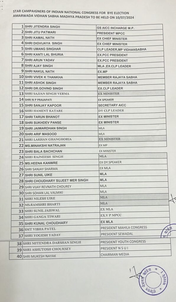 छिंदवाड़ा जिले की अमरवाड़ा विधानसभा सीट पर उपचुनाव होने जा रहा है। इसी बीच अब अमरवाड़ा उपचुनाव को लेकर कांग्रेस ने स्टार प्रचारकों की सूची जारी की है। स्टार प्रचारकों में 40 नेताओं के नाम शामिल है।बता दें कि इस बार कांग्रेस अमरवाड़ा उपचुनाव में प्रचार के लिए आदिवासी नेताओं की फौज उतारने जा रही है।