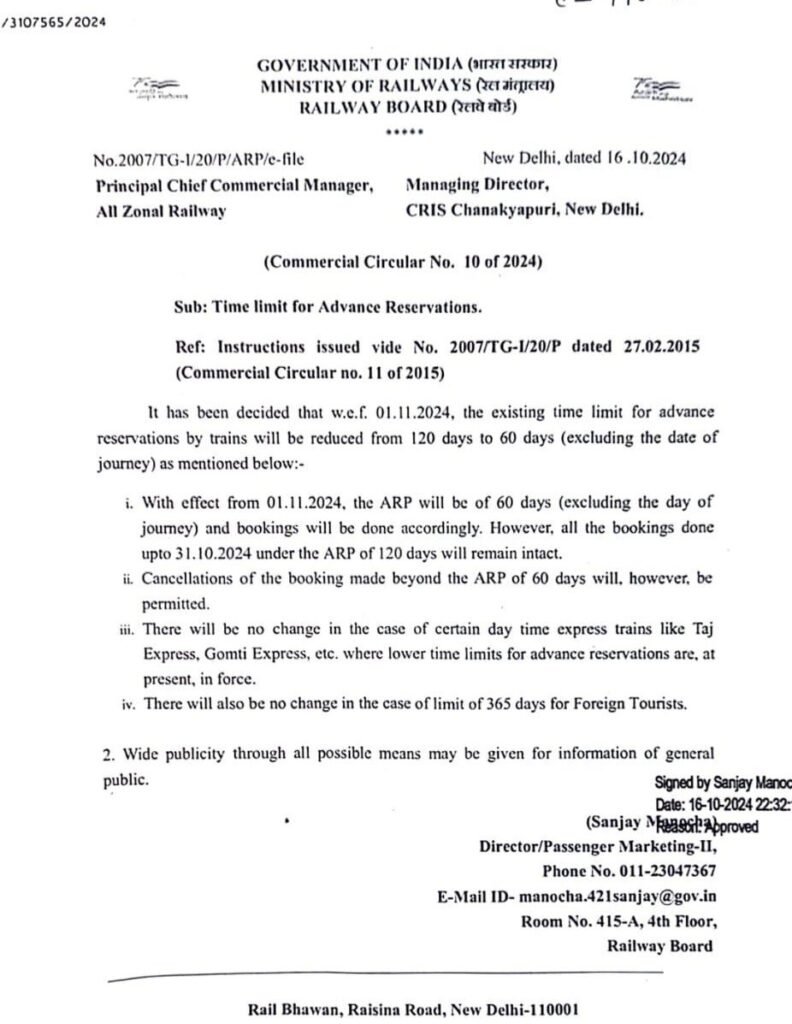 भारतीय रेलवे ने एडवांस टिकट बुकिंग व्यवस्था में बड़ा बदलाव किया है। नई व्यवस्था के मुताबिक, यात्रा के 60 दिन पूर्व की टिकट बुक किया जा सकेगा। अब तक 120 दिन पहले से टिकट बुक करने की सुविधा थी। रेलवे ने बदलाव की आधिकारिक जानकारी देते हुए बताया कि नई व्यवस्था 1 नंवबर से लागू होगी।