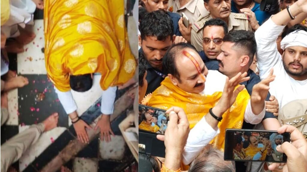 बरसाना। राधा रानी पर बयान देकर विवाद में आए पं. प्रदीप मिश्रा ने शनिवार को बरसाना पहुंचकर राधा रानी से माफी मांग ली। वह बरसाना स्थित राधा रानी मंदिर पहुंचे जहां उन्होंने राधा रानी के सामने दंडवत होकर नाक रगड़कर माफी मांगी। साथ ही राधा रानी को अपनी इष्ट बताया।इसके बाद मंदिर से बाहर निकले. हाथ जोड़कर ब्रज वासियों का अभिनंदन किया. इस दौरान श्रीजी मंदिर के पास प्रदीप मिश्रा की सुरक्षा के लिये बड़ी संख्या में पुलिस बल तैनात रहा.