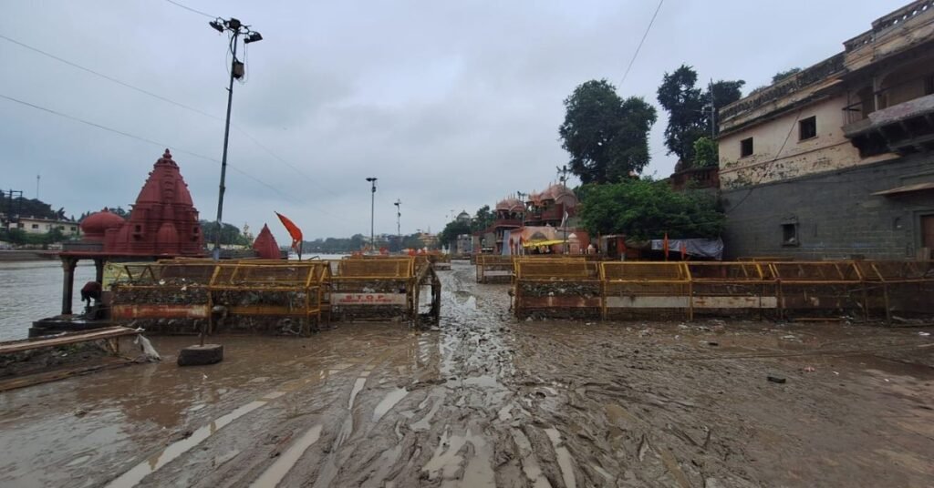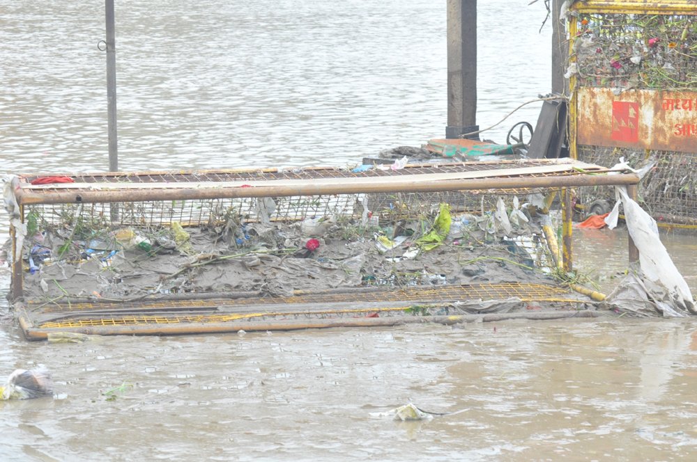 बाढ़ का पानी उतरते ही बैरिकेड्स में फंसा कचरा, शिप्रा के घाटों पर फैल गई मिट्टी
