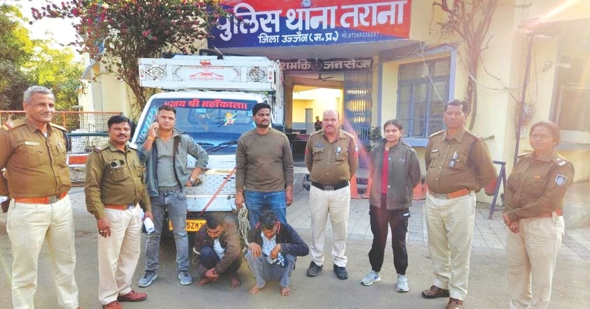 उज्जैन। पिकअप में गोवंश कर भरकर ले जा रहे दो तस्करों को तराना पुलिस ने गिरफ्तार किया है। पुलिस ने 8 बछड़ों को मुक्त करवाकर गोशाला भेजा और पिकअप जब्त किया है। तराना पुलिस ने बताया कि मंगलवार रात 11.40 बजे सूचना मिली थी कि पिकअप क्र. एमपी 15 जेडएम ३983 तराना से पचोर की ओर जा रही है जिस पर तिरपाल ढंककर गोवंश ले जाए जा रहे हैं। इसके बाद पुलिस ने वाहन का पीछा किया और ओवरटेक कर एबी रोड पर रोदवास जोड़ टोल नाके के पास रोका तो चालक और उसके साथी ने भागने की कोशिश की जिसे पुलिसकर्मियों ने धरदबोचा।