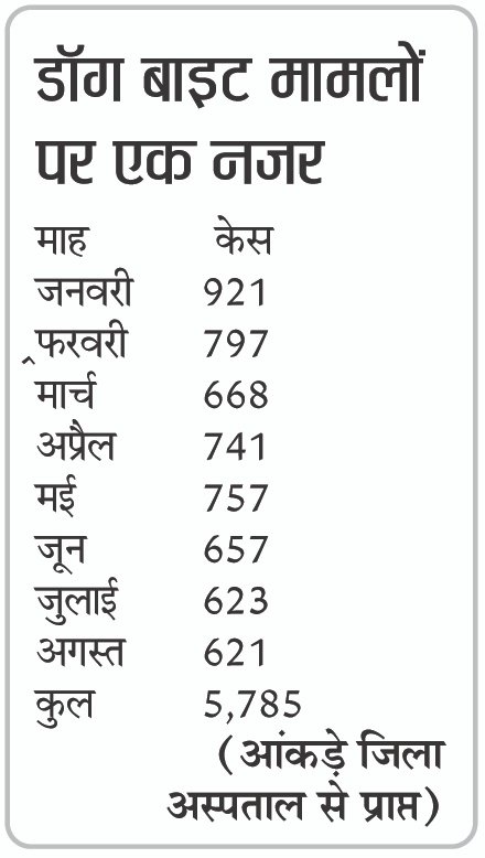 इलाज के दौरान उनकी भी मौत हो गई। आवारा कुत्तों को पकडऩे की जिम्मेदारी नगर निगम की है लेकिन चिंता की बात यह है कि इनकी रोकथाम के लिए ना तो उनकेे पास कोई कारगर व्यवस्था है और ना ही भविष्य को लेकर कोई प्लानिंग। जिला अस्पताल के डाटा को ही देखा जाए तो हर माह आवारा कुत्तों के काटने के 500 से ज्यादा मामले सामने आ रहे हैं। जनवरी से अगस्त तक पिछले 8 माह में कुल 5,785 मामले सामने आ चुके हैं। इससे पता चलता है कि आवारा कुत्ते किस कदर खतरा बन रहे हैं।