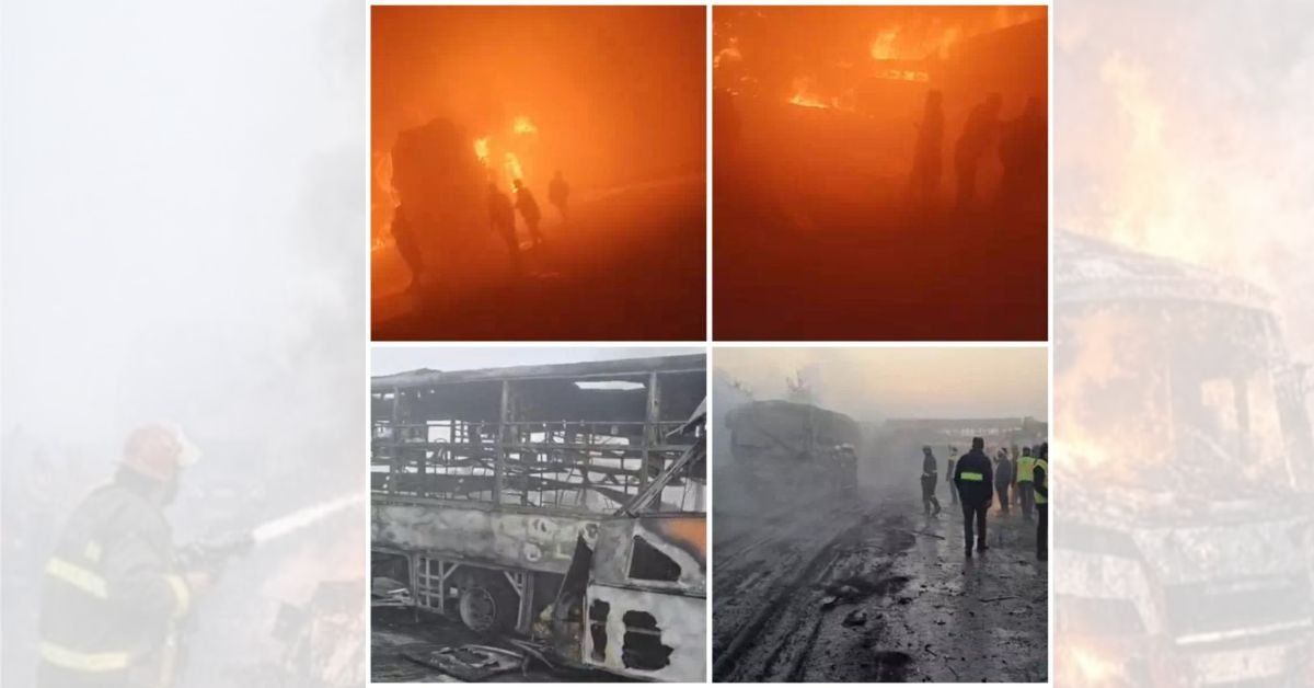 एक्सप्रेस-वे पर घना कोहरा था। माइलस्टोन 127 पर अचानक स्लीपर बस के सामने धुंध आ गई। इसके चलते ड्राइवर ने ब्रेक मारकर स्पीड धीमी की। इसके बाद पीछे चल रही 6 बसें और 4 कारें आकर भिड़ गईं। टक्कर से एसी बस में आग लग गई। लोगों को भागने तक का मौका नहीं मिला।
