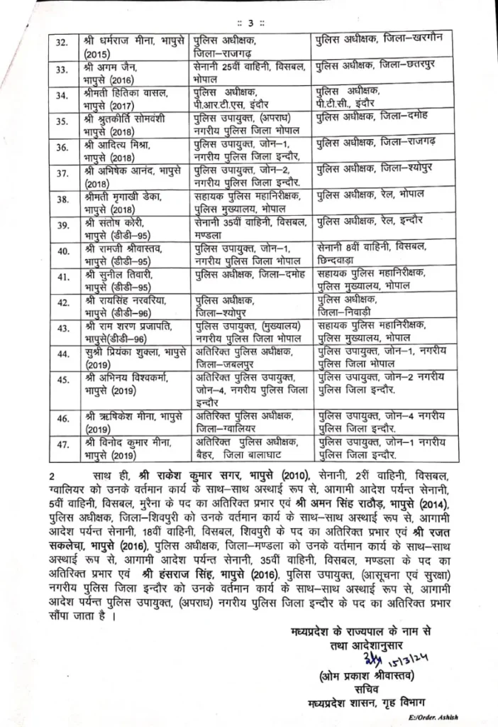 मध्यप्रदेश:47 IPS अफसरों के ट्रांसफर, 11 जिलों के SP बदले
