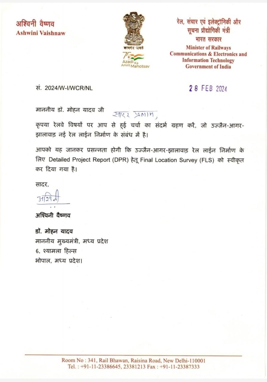 रेल मंत्री वैष्णव ने सीएम डॉ. यादव को लिखे पत्र में कहा है कि कृपया आपसे रेल लाइन के विषयों को लेकर हुई चर्चा का संदर्भ ग्रहण करें, जो उज्जैन, आगर, झालावाड़ नई रेल लाइन निर्माण के संबंध में है। आपको यह जानकर प्रसन्नता होगी कि उज्जैन, आगर, झालावाड़ रेल लाइन निर्माण के लिए डीपीआर हेतु फाइनल।लोकेशन (एफएलएस) सर्वे को स्वीकृत कर दिया है।
