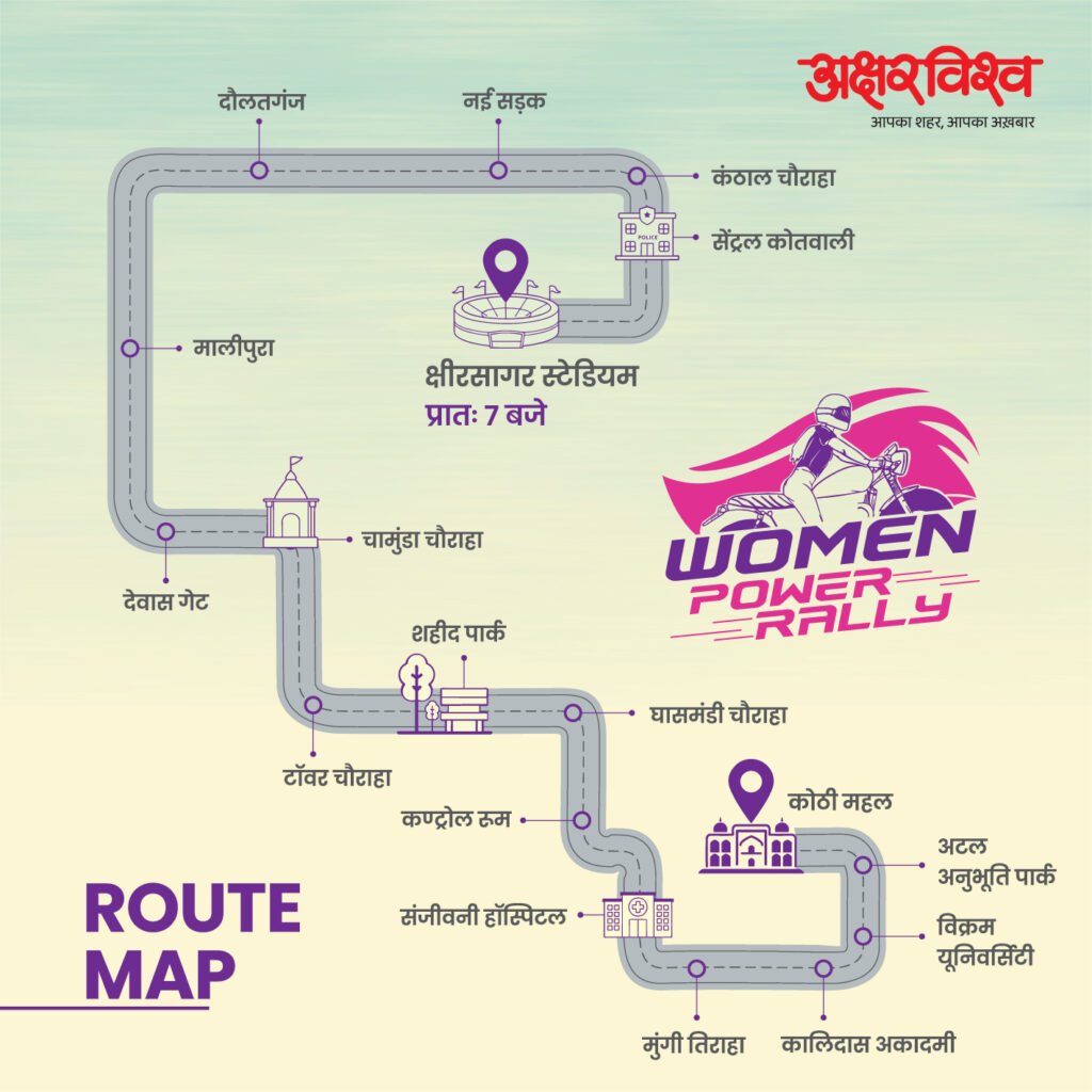 रैली के लिए सभी महिला पार्टिसिपेंट्स में अभूतपूर्व जोश और उत्साह देखने को मिल रहा है। अक्षरविश्व आपको मौका दे रहा है उज्जैन की सड़कों पर छा जाने का। 5 मई, रविवार को ठीक सुबह 7 बजे क्षीरसागर स्टेडियम से महिलाएं अपने 2/4 व्हीलर पर सवार होकर शहर के विभन्न मार्गों से होते हुए कोठी महल पहुंचेगी। रैली में समय से आएं, जिससे आपको किसी परेशानी का सामना ना करना पड़े। इस मौके को हाथ से ना जाने दें।